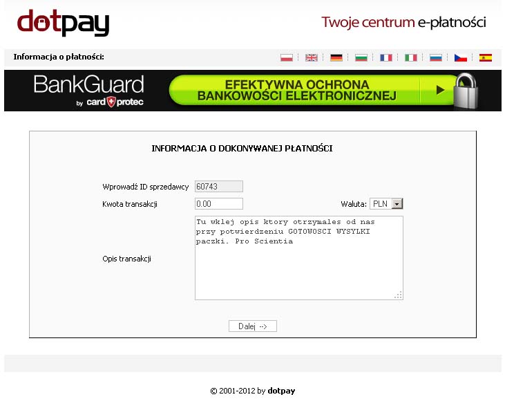 Po skompletowaniu książek otrzymają Państwo zwrotnie potwierdzenie zamówienia oraz link kierujący do serwisu ssl.DotPay.pl celem dokonania płatności kartą.